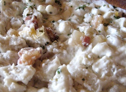 Hozzáadjuk a villával összetört ordát vagy túrót, majd az apróra vágott kapor zöldet és a habbá vert tojásfehérjéket.