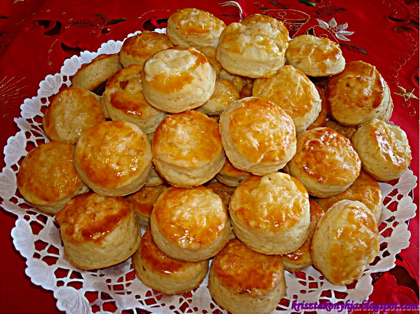 Végül ujjnyi vastagságúra kinyújtjuk, tetejét sűrűn kockásra bevagdaljuk, és nem túl nagy pogácsa szaggatóval kiszaggatjuk. A sütőt előmelegítjük 220 fokra (gázsütő: 4. fokozat). A pogácsák tetejét megkenjük tojássárgájával, és a sütőben kb. 20 percig sütjük.