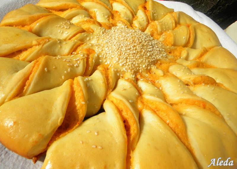 A tészta hozzávalóit megdagasztottam és duplájára kelesztettem.A kencéhez kikavartam a juhtúrót a tejföllel és a paprikakrémmel.A megkelt tésztát lisztezett deszkára borítottam és 4 egyenlő részre osztottam.Az egyik tésztát kinyújtottam 2-3 mm vastagságú,kör alakúra,lekentem a kencével és egy másik kinyújtott lappal befedtem.Egy lisztbe mártott poharat a kör közepére tettem és pizzavágóval felcsíkoztam a tésztát a pohárig.Minden sugarat kétszer megtekertem,fél órát pihenni hagytam majd felvert tojással lekentem és megszórtam szezámmaggal.Előmelegített sütőben 20 perc alatt sült ki.