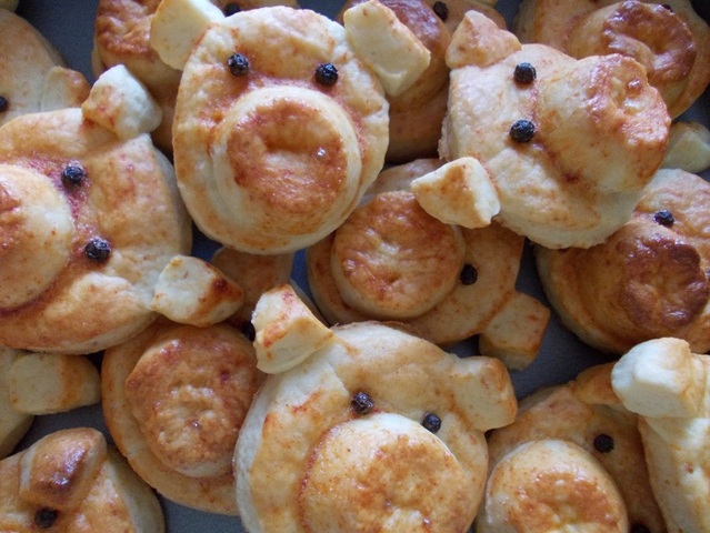 A hozzávallókat összegyúrni, vékonyra kinyújtani, kiszaggatni.
